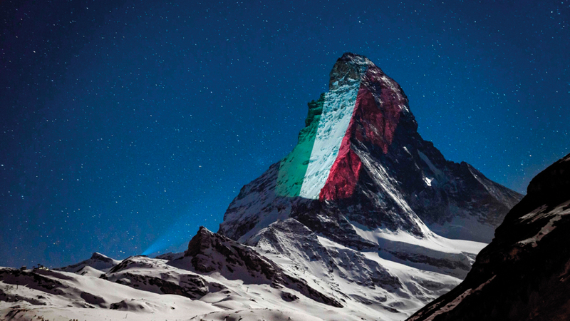 يُضاء جبل ماترهورن الشهير عند الحدود الإيطالية - السويسرية، البالغ ارتفاعه 4478 متراً، مساء كل يوم «كعلامة أمل وتضامن» خلال هذه الفترة التي يخيّم عليه بظلاله وباء «كوفيد 19».