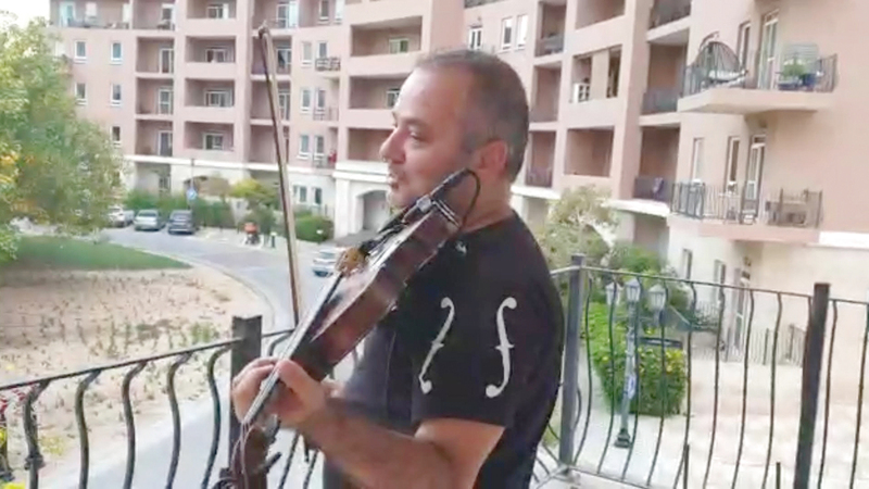 بأنامل تعشق الكمان، وإيمان راسخ بأن الموسيقى لغة عابرة للثقافات، وتتحدى الأزمات على اختلاف أنواعها، يقدم مؤسس وقائد أوركسترا «شرق» وعازف الكمان الموسيقي السوري، محمد حمامي، جرعة من الأمل الممزوج بالحلم من شرفة منزله في دبي، لكل الجيران الذين يصغون يومياً بشغف لموسيقاه، ويصفقون له ولمبادرته في إرسال كل هذا الفرح في الهواء الطلق والأفق الذي يجمعهم.