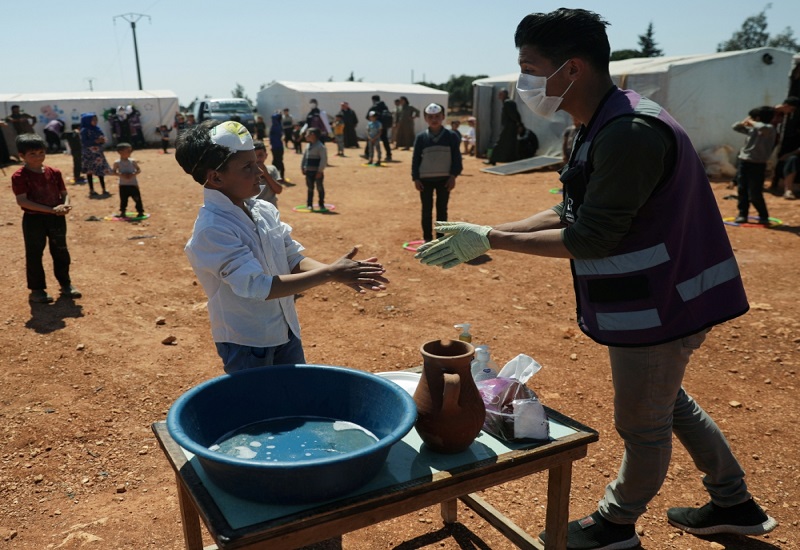 فقد وصل متطوعون لمخيم النازحين السوريين بقرية معرة مصرين شمال إدلب بهدف نشر الوعي بشأن فيروس كورونا المستجد، الذي يسبب مرض كوفيد-19 بين الفئات الضعيفة، وتعريفهم بسُبُل الوقاية منه.