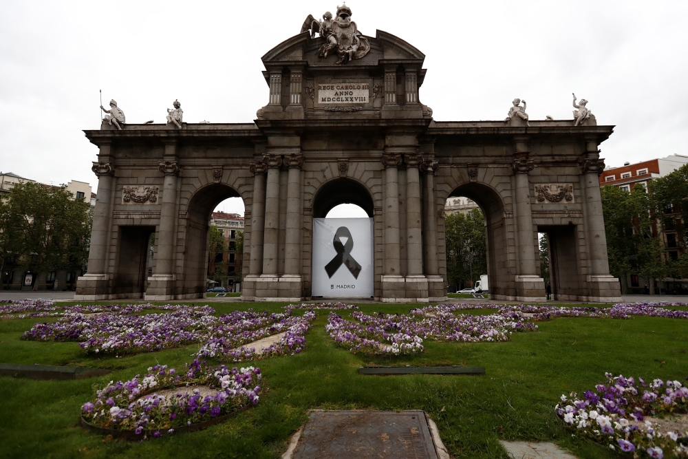 تم اليوم الخميس تعليق لافتة سوداء أمام "بويرتا دي ألكالا"، وهو أحد أشهر معالم العاصمة الإسبانية مدريد، حدادا على 22 ألف شخص لقوا حتفهم في إسبانيا جراء إصابتهم بفيروس كورنا.