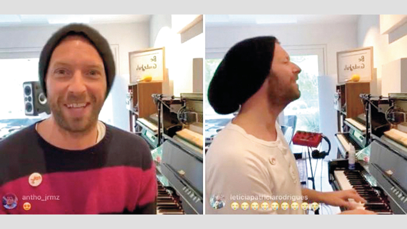وصوّر كريس مارتن قائد فرقة «كولدبلاي» مقاطع فيديو في الاستوديو المنزلي وهو يعزف على البيانو والغيتار، معتمراً قبعة. وتلقّى طلبات معجبيه مباشرة من بلدان عدة بينها إيران وإيطاليا، وأدى لهم مقطوعات موسيقية لنصف ساعة.