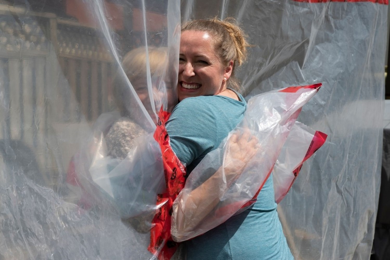 توصلت شابة كندية إلى طريقة مبتكرة لمعانقة والدتها بأمان أثناء تفشي فيروس كورونا... «قفاز العناق»، وهو ستارة بلاستيكية مزودة بأربعة أكمام ومعلّقة على حبل غسيل.