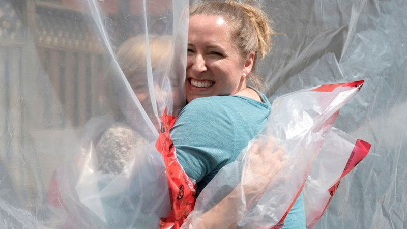 توصلت شابة كندية إلى طريقة مبتكرة لمعانقة والدتها بأمان أثناء تفشي فيروس كورونا، باستخدام «قفاز العناق»، وهو ستارة بلاستيكية مزودة بأربعة أكمام ومعلقة على حبل غسيل.