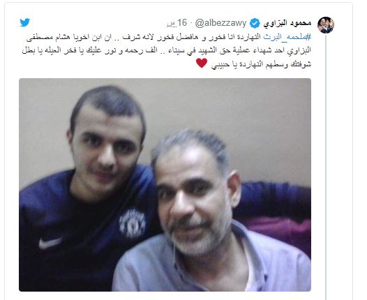 وكتب محمود البزاوي في تغريدته «النهاردة انا فخور و هافضل فخور لانه شرف.. انا ابن اخويا هشام مصطفى البزاوي أحد شهداء عملية حق الشهيد في سيناء .. ألف رحمه و نور عليك يا فخر العيله يا بطل شوفتك وسطهم النهاردة يا حبيبي».