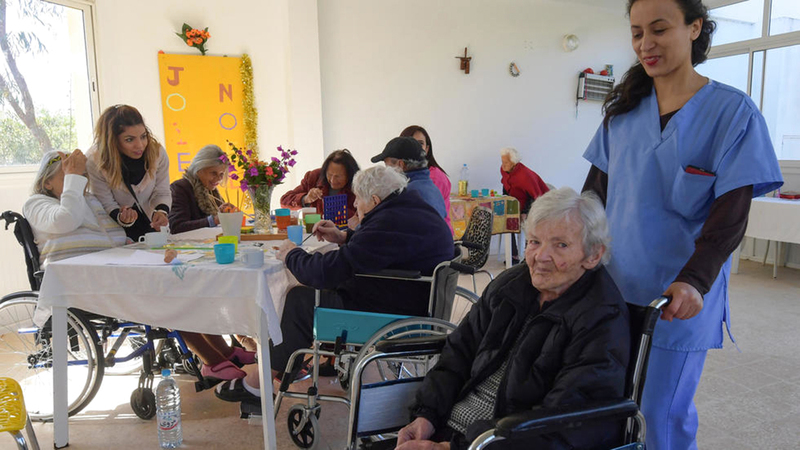 تجلس أوديت الفرنسية على كرسيّها قبالة النافذة وبين أناملها قطعة قماش تطرّز عليها أشكالاً فنية، وهي نزيلة في مركز لرعاية المسنين يشغل جزءاً من فندق سياحي قريب من البحر في تونس التي تريد النهوض بهذا النوع من الخدمات.