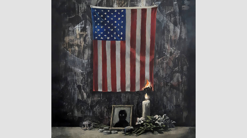 نشر رسام الشارع البريطاني، بانكسي، عملاً فنياً جديداً على الإنترنت، أمس، يصوّر فيه العلم الأميركي، وقد أمسكت به النار من شمعة تشكل جزءاً من نصب تذكاري لشخص أسود على غرار النصب التذكاري للجندي المجهول.