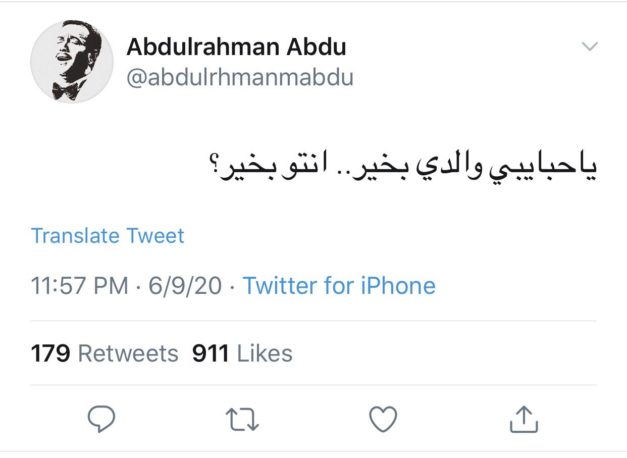 نفى عبدالرحمن، نجل الفنان السعودي محمد عبده، شائعة إصابة والده بفيروس كورونا المستجد، مؤكداً في تغريدة نشرها عبر حسابه على "تويتر": "يا حبايبي والدي بخير.. انتو بخير؟".