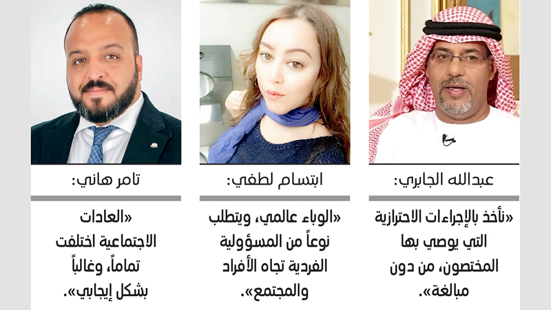 وتتفق ابتسام لطفي، موظفة، مع الدكتور الجابري، في الرأي، مؤكد أن «كورونا» وباء عالمي يتطلب نوعاً من المسؤولية الفردية تجاه الأفراد والمجتمع، من أجل الحد من انتشار المرض، والتعامل بكياسة في إطار لا ضرر ولا ضرار، ومن وجهة نظري «لا للتهويل ولا الاستهتار»، في إطار التعامل مع الأقارب والأصدقاء، مع الحرص على احترام التعليمات كعدم التقبيل والمصافحة وغسل اليدين وغيرها، فالموضوع يتطلب الوعي من الجميع.