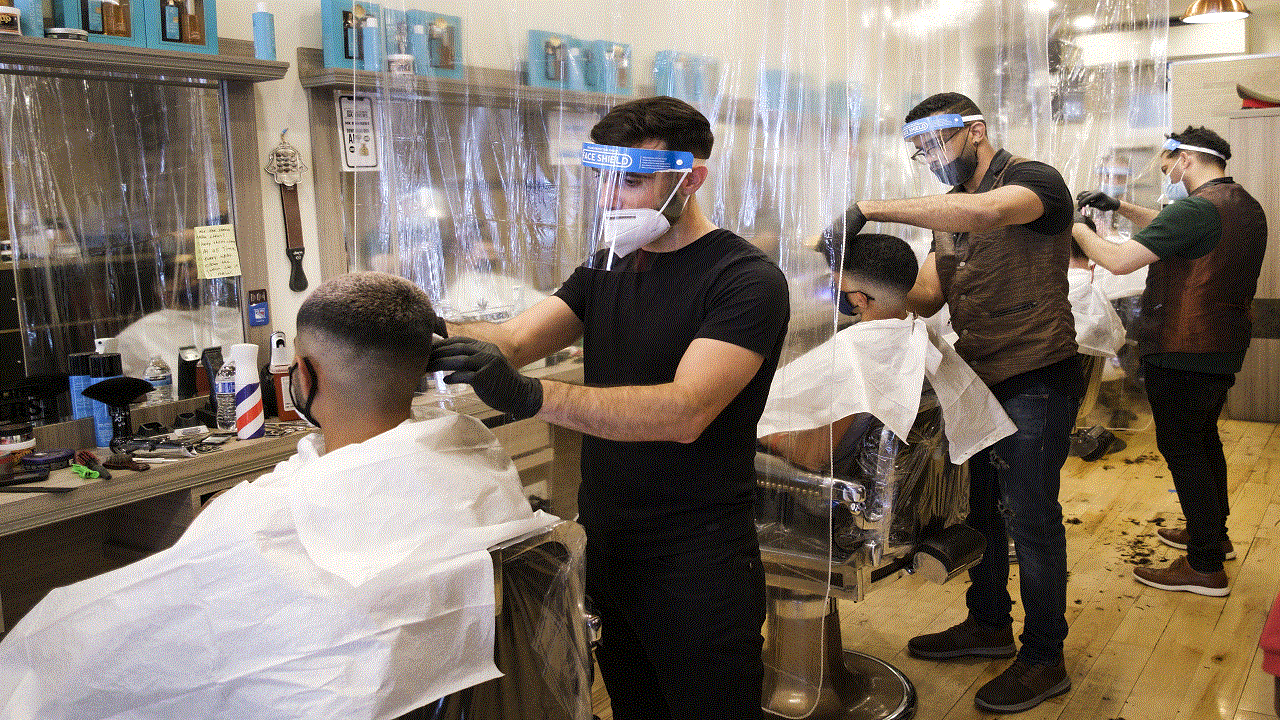 أصبح وضع الكمامات والقفازات وقياس درجة الحرارة من القواعد المرعية قبل قص الشعر مقابل ألف دولار في صالون جوليان فاريل الفاخر، الذي فتح أبوابه مجددا مع انتقال مدينة نيويورك إلى مرحلة متقدمة من استئناف النشاط بعد الإغلاق جراء تفشي مرض كوفيد-19 الذي يسببه فيروس كورونا.