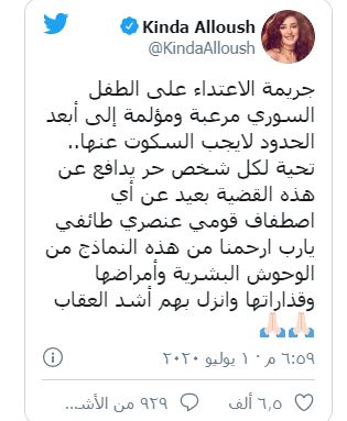 وقالت الفنانة السورية كندة علوش: "جريمة الاعتداء على الطفل السوري مرعبة ومؤلمة إلى أبعد الحدود لا يجب السكوت عنها .. تحية لكل شخص حر يدافع عن هذه القضية بعيد عن أي اصطفاف قومي عنصري طائفي، يا رب ارحمنا من هذه النماذج من الوحوش البشرية وأمراضها وقذاراتها وأنزل بهم أشد العقاب".