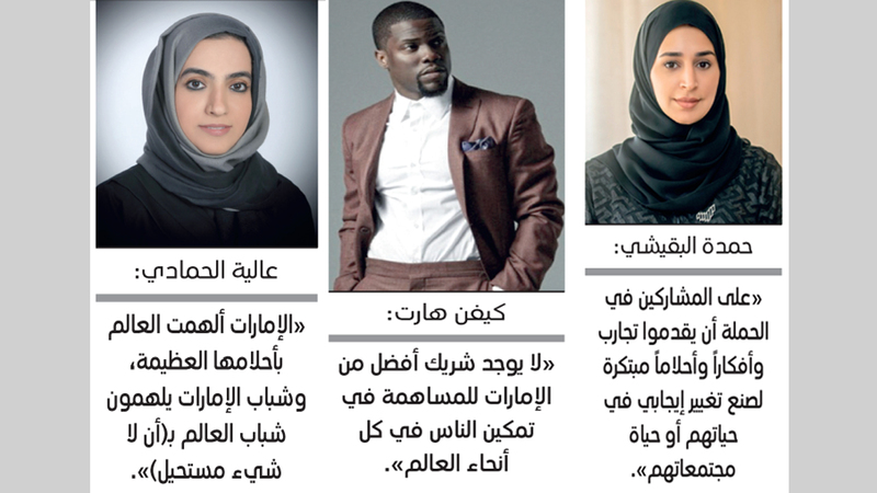 وأكدت مدير مكتب الهوية الإعلامية للإمارات عالية الحمادي أن «الإمارات ألهمت العالم بأحلامها العظيمة، وشباب الإمارات يلهمون شباب العالم بـ(أن لا شيء مستحيل)».