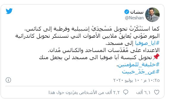 وغرد نيشان عبر حسابه على موقع «تويتر»: «كما استَنْكَرْتُ تحويل مَسْجِدَيْ إشبيلية وقرطبة إلى كنائس، اليوم صَوْتي يُعانِقُ ملايين الأصوات التي تستنكر تحويل كاتدرائية #آيا_صوفيا إلى مسجد. الاعتداء على مُقَدّسات المساجد والكنائس مُدان». وتابع: «تحويل كنيسة آيا صوفيا الى مسجد لن يجعل منك #خليفة_للمؤمنين. #عن_جَدّ_خبيث».
