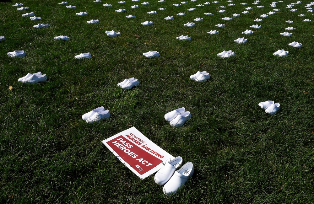 وقالت ستيفاني سيمز من نقابة "ناشيونال نيرسز يونايتد" التي يبلغ عدد أعضائها 155 ألفاً، وتُعَدُّ كبرى نقابات الجسم التمريضي في الولايات المتحدة "قبل شهرين، في مايو، كنا أمام البيت الأبيض محاطات بثمانية وثمانين زوج حذاء، يرمز كلّ منها إلى ممرضة قضت بسبب كوفيد-19".