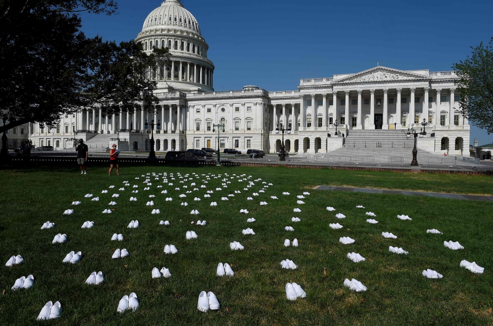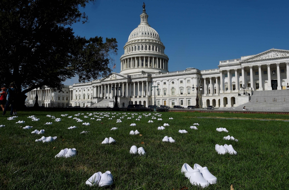 ووُزّعَت الأحذية البلاستيكية البيضاء على المساحة العشبية أمام مبنى الكابيتول، مقرّ مجلسي النواب والشيوخ.