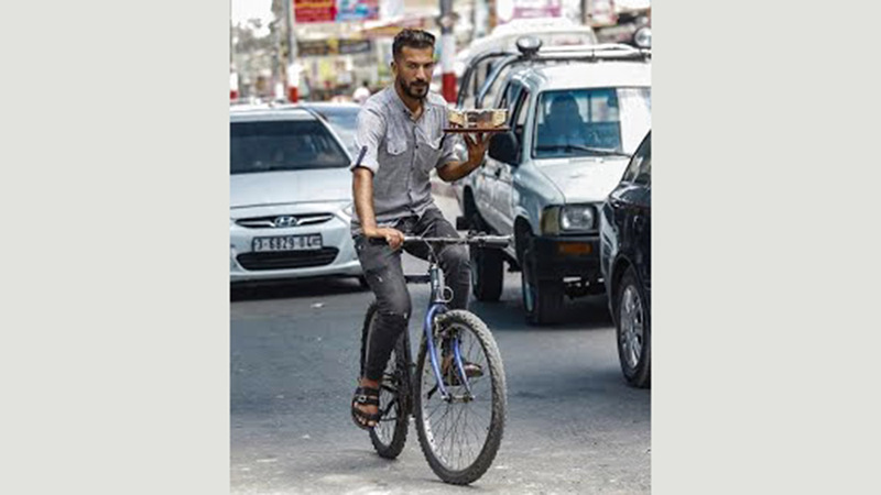 يمسك شعبان حمودة مقود درّاجته الهوائية بيد، ويحمل بالأخرى صينية وضع عليها أكواب القهوة، ثم يناور بين المركبات لإيصالها إلى زبائنه، في أول خدمة توصيل يقدمها مقهى في رفح جنوب قطاع غزة الفقير والمحاصر.