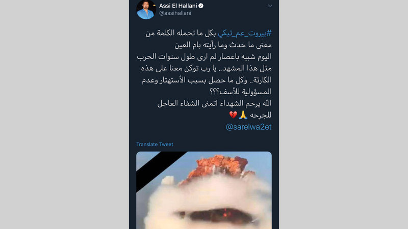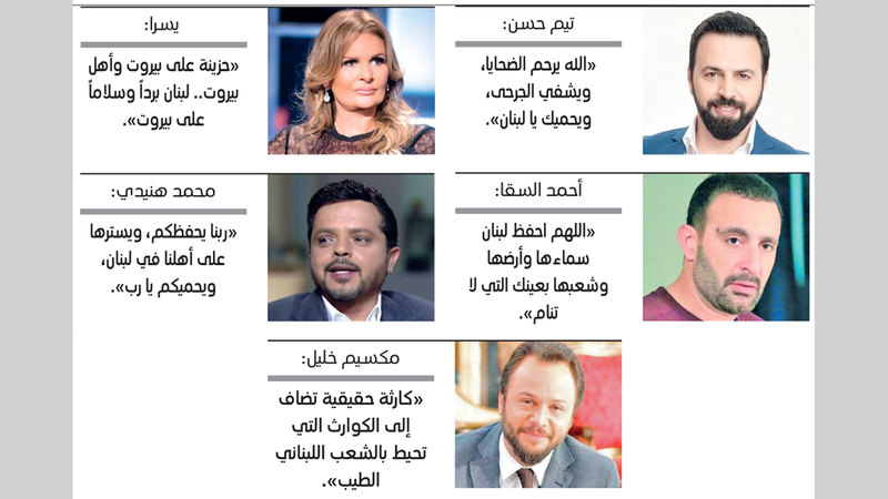 وسارع الفنان التونسي صابر الرباعي، عبر صفحاته الرسمية على «تويتر» و«فيس بوك» إلى التعبير عن حزنه قائلاً: «اللهم الطف بلبنان وشعب لبنان الشقيق»، مرفقاً التعليق بصورة للعلمين التونسي واللبناني، فيما قالت درة: «اللهم إني أستودعك لبنان وشعب لبنان». أما النجم العالمي ريد وان، فاكتفى بنشر صورة كتب فيها: «ندعي لك يا لبنان»، وانضم إليه القيصر كاظم الساهر، الذي عبّر عن مؤازرته التامة للشعب اللبناني «الحبيب».