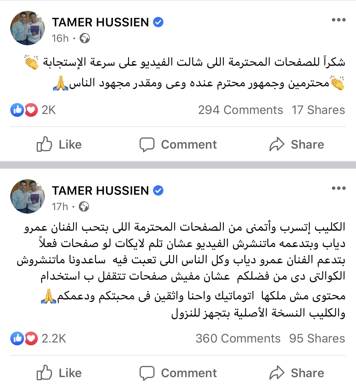 وعاد لينشر تعليق جديد يشكر فيه الجمهور على سرعة استجابته لطلبه: "شكرا للصفحات المحترمة اللي شالت الفيديو على سرعة الاستجابة، محترمين وجمهور محترم عنده وعي ومقدر مجهود الناس".