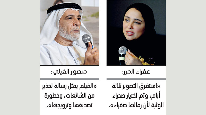 «لم أقل كلامكم».. رسالة تحذير من الشائعات وما يمكن أن ينتج عنها من نتائج قد تصل إلى تدمير حياة البعض، يطلقها الفيلم الوثائقي الإماراتي «أثل»، الذي يعدّ التجربة الأولى في مجال الإخراج للشيخة اليازية نهيان آل نهيان، واستطاع الفيلم أن يحصد جوائز عالمية، ويشارك حالياً في عدد من مهرجانات السينما المعروفة حول العالم. وتم عرضه مساء أول أمس، في عرض خاص لممثلي وسائل الإعلام في سينما فوكس بـ«النيشن تاور» في أبوظبي، وهو أول حدث من هذا النوع يتم تنظيمه في الواقع بعد أزمة «كورونا» المستجد.