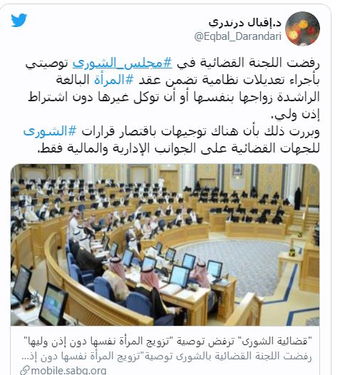 تجدد الجدل عبر مواقع التواصل الاجتماعي حول تزويج المرأة السعودية لنفسها بعد تغريدة لعضو مجلس الشورى السعودي، إقبال درندري، ناقشت فيها حق المرأة في تزويج نفسها بدون إذن ولي أمرها.