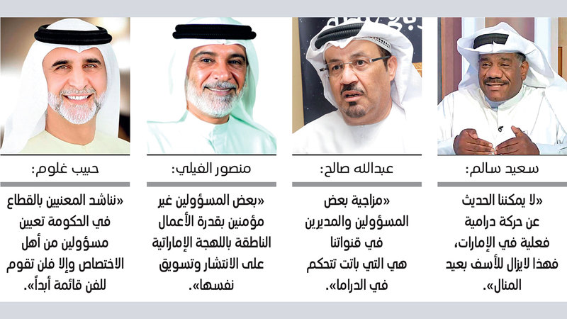 من جانبه، يضم الممثل والمسرحي الإماراتي القدير عبدالله صالح صوته إلى صوت الفنان سعيد سالم، ملقياً المسؤولية كاملة على القنوات التلفزيونية المحلية التي يجدها تعرقل مسار التقدم الدرامي وحتى حركة الفنان المحلي، مؤكداً أن «مزاجية بعض المسؤولين والمديرين المتناوبين على إدارة الدراما في قنواتنا ورغباتهم المتفاوتة في إنتاج أعمال محلية، هي التي باتت تتحكم في الدراما، ما يجعل العملية غير ممنهجة ومحتكمة إلى ضوابط واضحة تعطي فرصاً كافية للمنتجين المحليين لعرض أعمالهم وللممثلين للظهور، ما دفع بعضهم إلى الاتجاه نحو الدراما الكويتية أو إلى المسرح أو حتى إلى ترك المجال كلياً، بسبب القصور الملاحظ لدى الجهات المسؤولة عن القطاع».