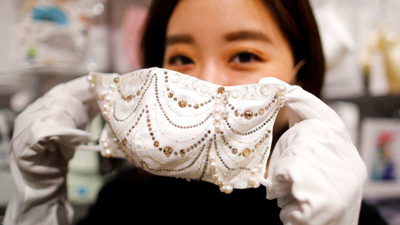 يمكن الآن لأيقونات الموضة في اليابان حماية النفس من فيروس «كورونا» بنوع من البذخ والترف.. كمامات مرصعة بالألماس واللآلئ يبلغ ثمن الواحدة منها مليون ين (9600 دولار).
