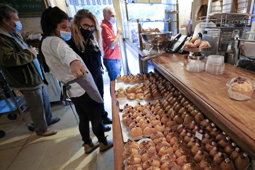 واصطف العشرات خارج متجر كادوش الشهير في القدس، واضعين الكمامات الواقية من فيروس كورونا، لشراء الكعك المحلى للعطلة التي يتخللها أيضا مهرجان للأضواء.