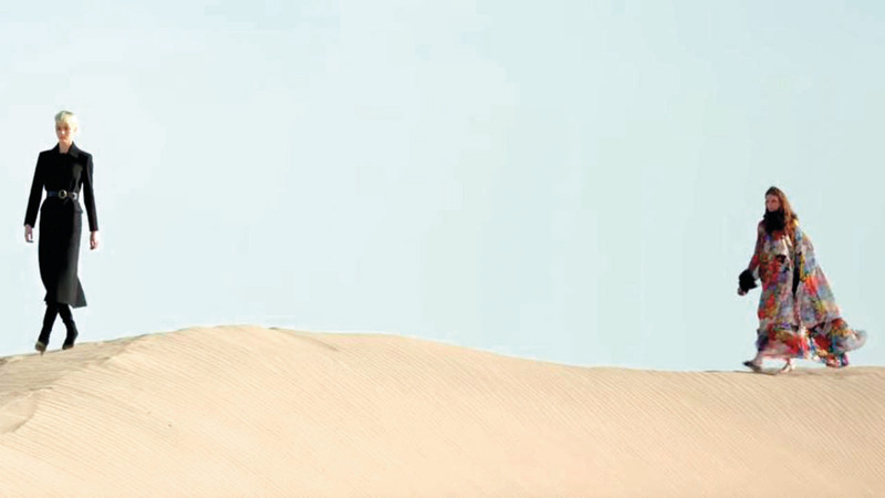 لم يكن هناك مشاهدون أو مؤثرون أو مصممو أزياء في عرض بيت أزياء سان لوران لمجموعته من أزياء النساء لصيف 2021.. فقط طائرة مسيرة تلتقط صور عارضات يمشين على كثبان رملية وسط رمال الصحراء ذهبية اللون.