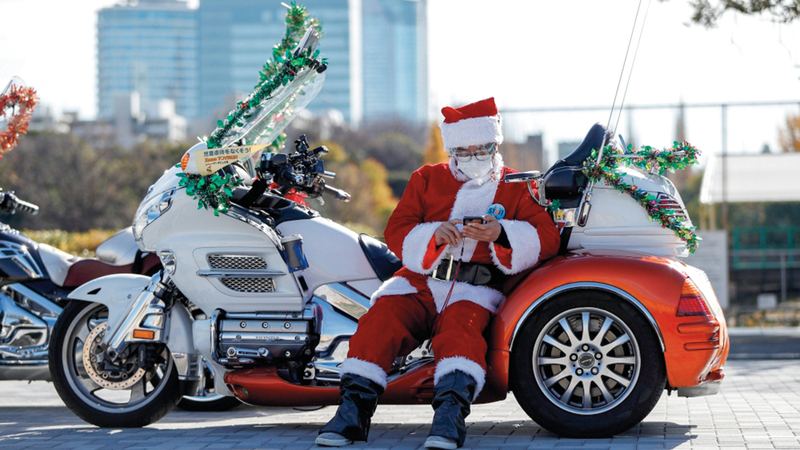 في زي بابا نويل.. تجول سائقو دراجات نارية في وسط العاصمة اليابانية طوكيو، أمس، ضمن استعراض سنوي للتنديد بإساءة معاملة الأطفال.