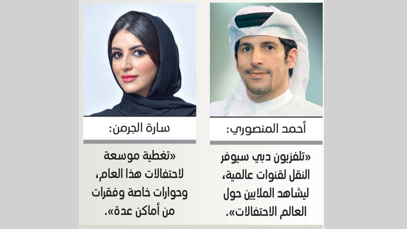 من ناحيتها، أكدت مديرة القنوات العامة في قطاع الإذاعة والتلفزيون مديرة تلفزيون دبي، سارة الجرمن، أن تلفزيون دبي سيوسّع تغطيته لاحتفالات هذا العام، من خلال البث المباشر من استوديوهاته الخاصة من موقع الحدث، إذ سيواكب احتفالات العام الجديد من الاستوديو الخاص في منطقة «برج بارك»، كما سيبث حوارات خاصة وفقرات مباشرة.