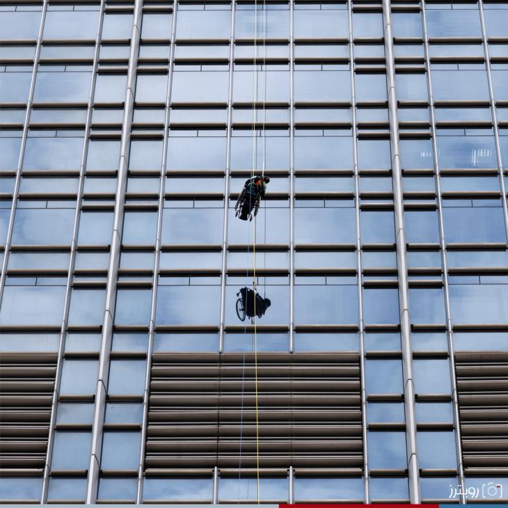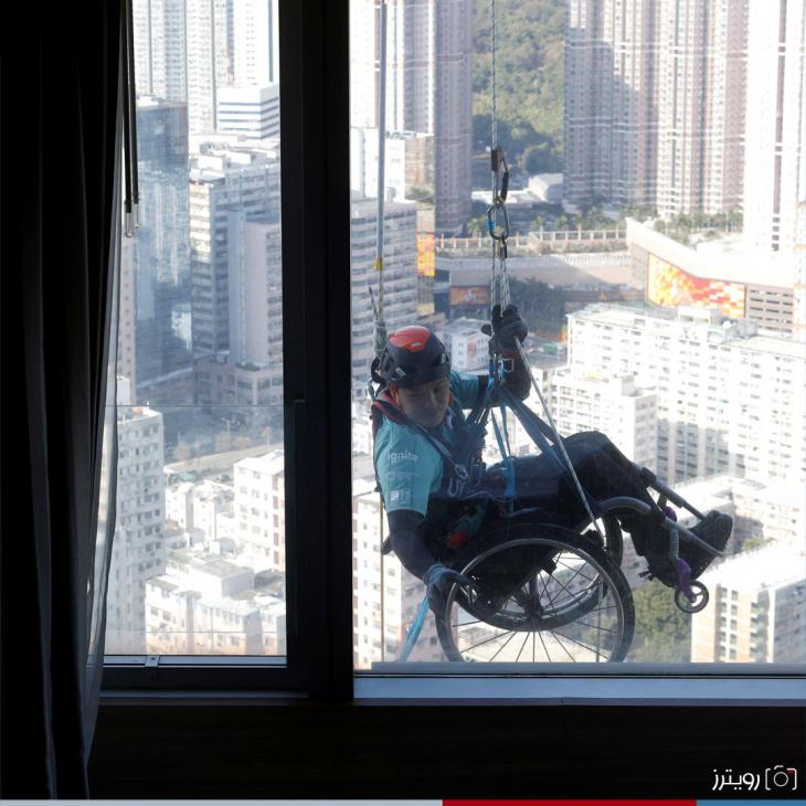 "بالصور" بكرسي متحرك وشلل نصفي .. قعيد يتسلق ناطحة سحاب في هونج كونج