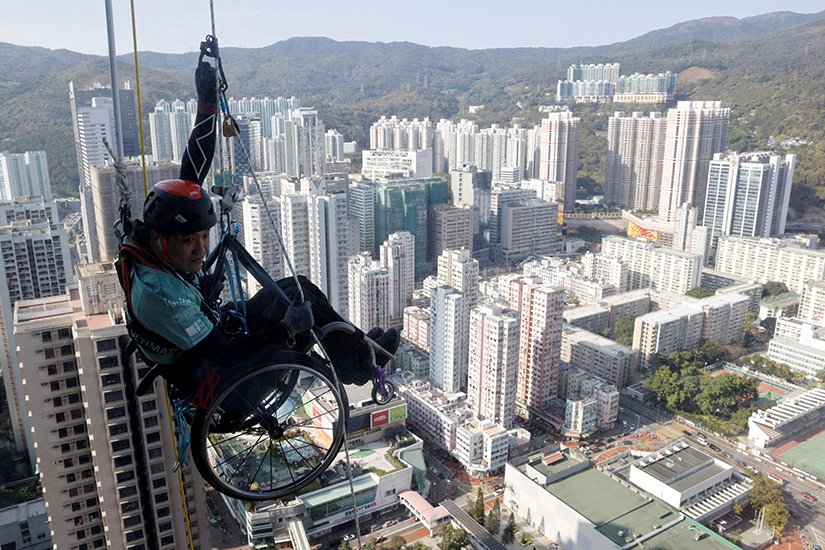 أصبح لاي تشي-واي أول رجل في هونج كونج يتسلق أكثر من 250 مترا من واجهة ناطحة سحاب وهو مربوط بكرسي متحرك حيث استغرق أكثر من عشر ساعات لتحقيق هذا الإنجاز أمس من أجل جمع تبرعات لذوي إصابات الحبل الشوكي.