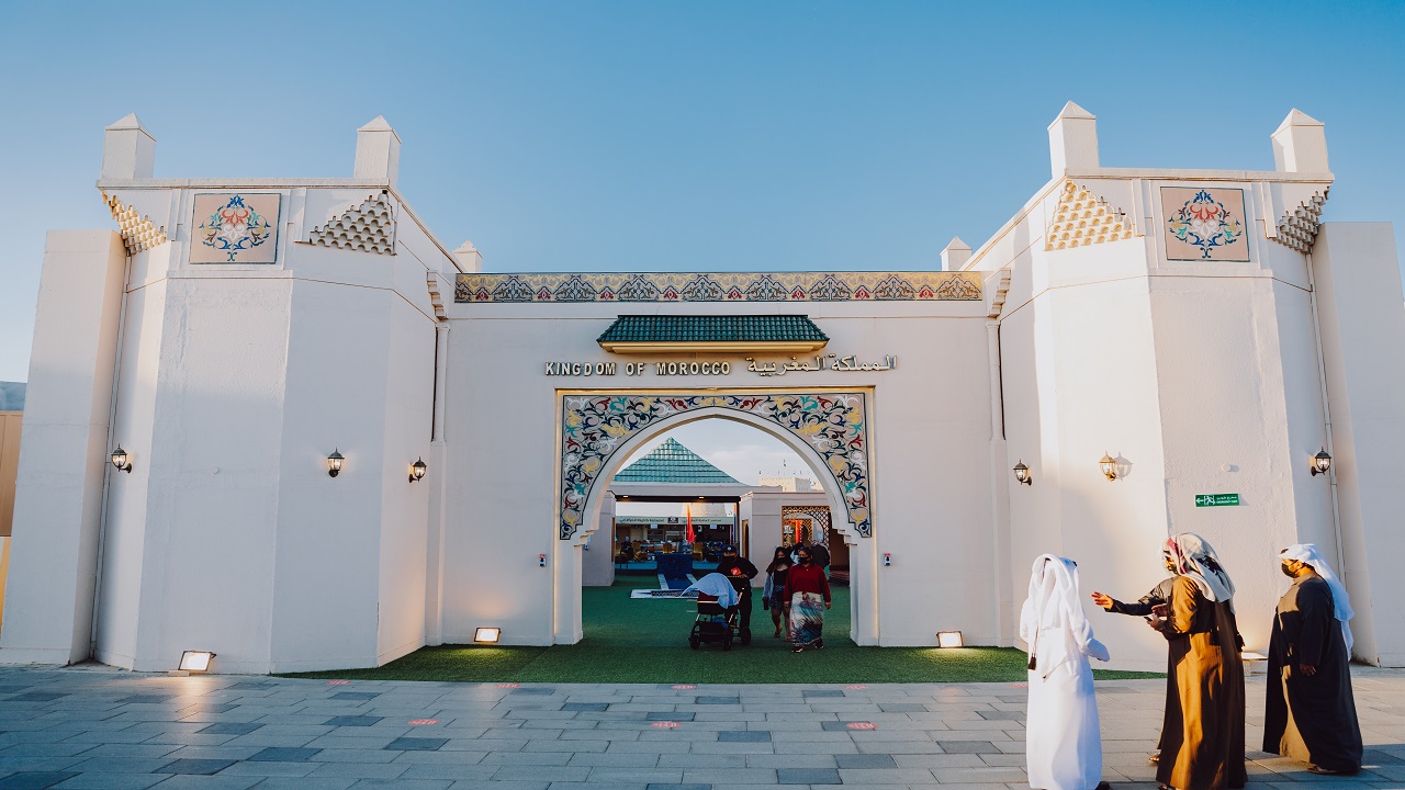 ويستقبل الجناح الزائر بأجواء فريدة مغلفة بالفخامة، يلاحظها المرء منذ مروره من بوابة الجناح التي صممت بهندسة معمارية غاية في الدقة والروعة لتجسد بوابة فاس الشهيرة، ليجد الزائر نفسه وسط عشرات المحال المصممة هي الأخرى على شكل سوق شعبي مغربي، تتوسطها ساحة كبرى تزينها النوافير والفسيفساء والجلسات المغربية، بالإضافة إلى المسرح الذي يقدم عروضاً فنية على مدار اليوم.