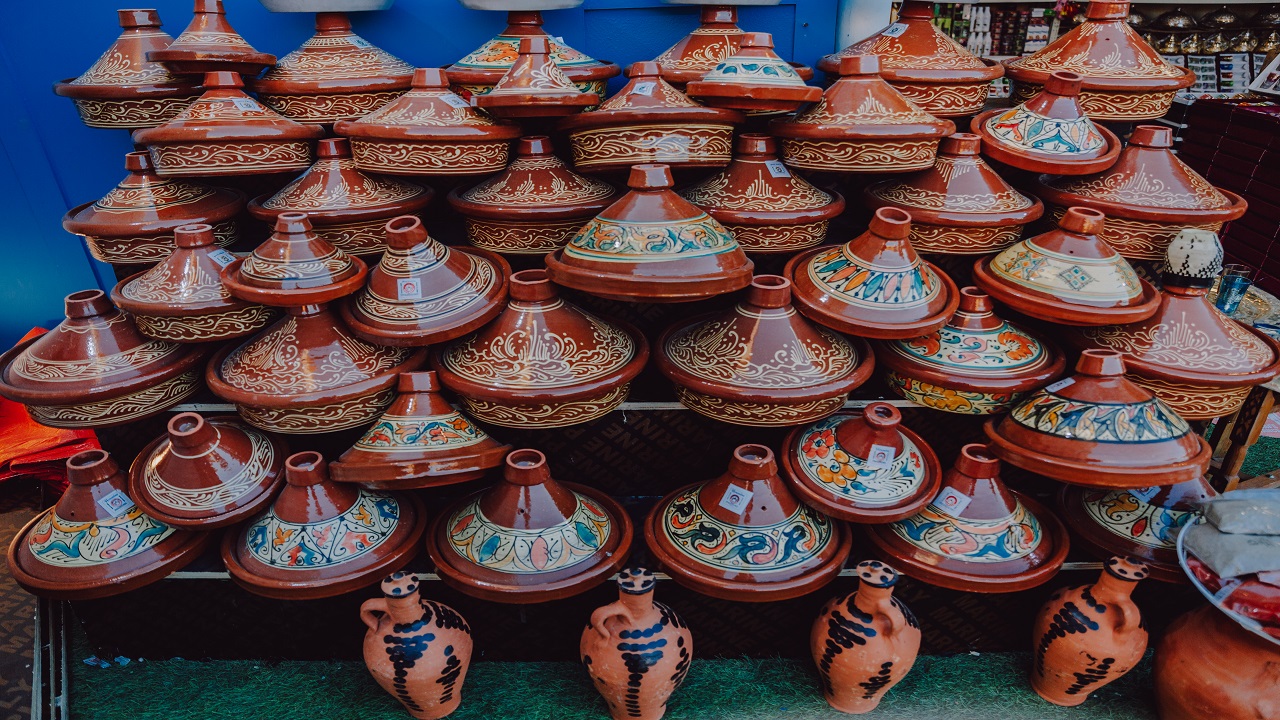 وتزخر محال الجناح المغربي بمجموعة كبيرة ومتنوعة من الملابس التقليدية المنتشرة في كل ربوع المملكة المغربية، إذ تعرض الكثير من المحال تصاميم من الملابس النسائية التي تعد رمزاً للأناقة، مثل القفطان المغربي والكندورة وإكسسواراتها من الأحزمة الفضية والشربيل والبلغة، والتي تختلف في تصاميمها وتنفيذها حسب كل منطقة لتظهر التنوع الجميل في الزي المغربي والمناسبات التي يتم ارتداؤه فيها.