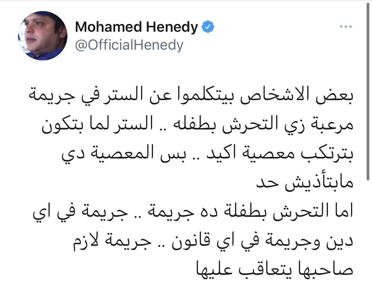 الفنان محمد هنيدي، كان أول من تفاعل مع الحادث، معربا في تغريدة عبر حسابه على موقع «تويتر»، عن صدمته من بشاعته، وقال: «الفيديو المنتشر لكائن بيتحرش بطفلة بريئة مرعب لدرجة مخيف، ومانصحش حد يشوفه، والحسنة الوحيدة إنه أظهر وحش من وسط وحوش كتير بتعيش بينا ورا وش بلاستيك بيخفي صفات أبشع مما نتصور». ثم عاد وغرد منتقدا موقف البعض الرافض لفضح المتحرش والعمل بمبدأ الستر، قائلا: «بعض الأشخاص بيتكلموا عن الستر في جريمة مرعبة زي التحرش بطفلة..الستر لما بتكون بترتكب معصية أكيد، بس المعصية دي مابتأذيش حد، أما التحرش بطفلة ده جريمة.. جريمة في اي دين وجريمة في أي قانون.. جريمة لازم صاحبها يتعاقب عليها، والحمد لله إنه اتقبض عليه».