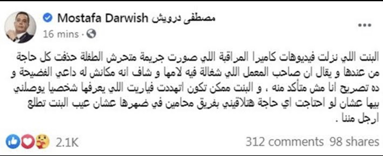 واتخذ الفنان مصطفى درويش موقفا إيجابيا لدعم الفتاة التي تصدت للمتحرش، بعد تردد أقاويل عن تعرضها لضغوط من أهل المتحرش ورئيسها في العمل، وكتب: «البنت اللي نزلت فيديوهات كاميرا المراقبة اللي صورت جريمة متحرش الطفلة حذفت كل حاجة من عندها و يقال إن صاحب المعمل اللي شغالة فيه لامها و شاف أنه مكانش له داعي الفضيحة و ده تصريح انا مش متأكد منه». وتابع: «البنت ممكن تكون اتهددت فياريت اللي يعرفها شخصيا يوصلني بيها عشان لو احتاجت أي حاجة هتلاقيني بفريق محامين في ضهرها عشان عيب البنت تطلع أرجل مننا».