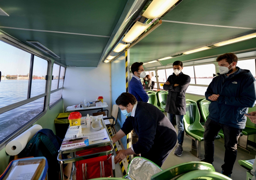 تلقى سكان جزيرتين في البندقية جرعات اللقاح المضاد لفيروس كورونا على متن زورق "فابوريتو" بعد تحويله عيادة عائمة خصيصاً لهذا الغرض. وخُصصت واحدة من هذه "الحافلات" المائية التي تنقل الركاب في البحيرة لتلقيح أشخاص تزيد أعمارهم عن 80 عاماً يعيشون في جزيرتي سانت إيراسمو وفينيول.
