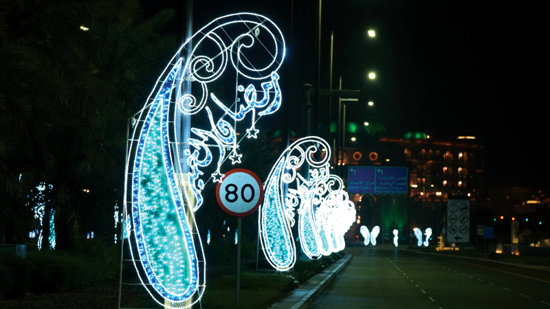 وتنتشر على جانبي الطرق والجزر الوسطية والدوارات والجسور مجسمات العبارات المضيئة التي تحاكي الشهر الفضيل والعادات الإماراتية المتعلقة به، ومن بينها «مبارك عليكم الشهر»، «رمضان كريم» و«شهر الخير».