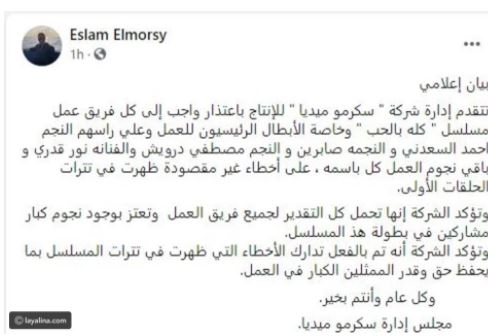 وأضاف: "وتؤكد الشركة إنها تحمل كل التقدير لجميع فريق العمل وتعتز بوجود نجوم كبار مشاركين في بطولة هذا المسلسل، وتؤكد الشركة أنه تم بالفعل تدارك الأخطاء التي ظهرت في تترات المسلسل بما يحفظ حق وقدر الممثلين الكبار في العمل".