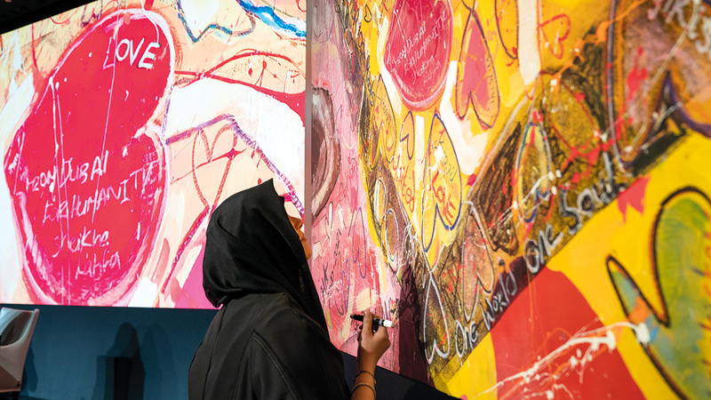 • لطيفة بنت محمد وقّعت لوحة «الطريق إلى رحلة الإنسانية» للفنان ساشا جفري دعماً للمزاد الخيري.