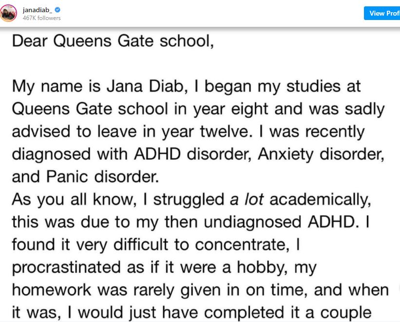 وأكملت:"شعرت بسوء كبير بسبب شعوري بأن مدرسيني ليس لديهم الصبر الكافي للتعامل معي، ونقلي إلى تلك المدرسة أثر على صحتي العقلية بشكل كبير، وجعلني أحتقر نفسي لكوني ما أنا عليه الآن، وفي النهاية حصلت على دبلوم في الغناء من جامعة BIMM، والآن أنا في السنة التأسيسية في جامعة Goldsmiths وأدرس الأدب الإنجليزي وأحقق علامات عالية، وأحاول الحصول على دراسة علم الاجتماع".