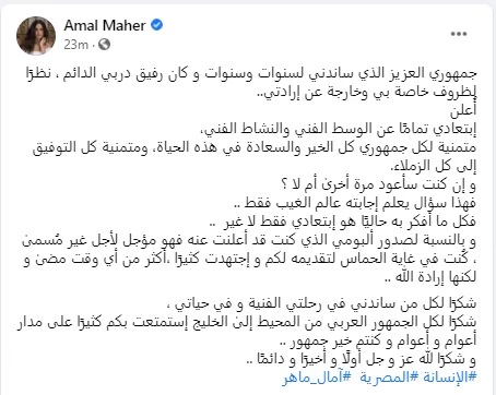 تصدرت المطربة المصرية الشهيرة آمال ماهر حديث الناس ومواقع التواصل الاجتماعي ومنصات التواصل الإجتماعي، في الساعات الأولى من صباح اليوم معلنة، اعتزالها النهائي للغناء والفن، وفوجئ جمهور آمال ماهر بمنشور كتبته على "فيس بوك" ومنصات التواصل المختلفة قالت فيه "جمهوري العزيز الذي ساندني لسنوات وسنوات و كان رفيق دربي الدائم ، نظرًا لظروف خاصة بي وخارجة عن إرادتي".