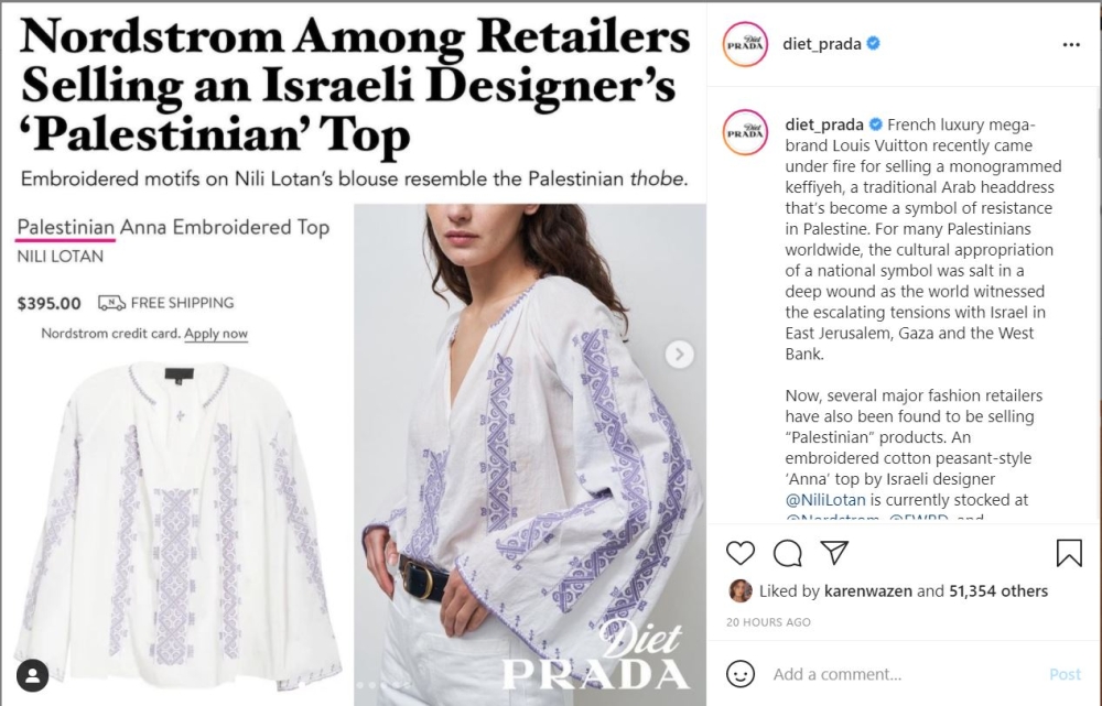 ورغم ضغط المجتمع العالمي الذي واجهته الدار عبر منصات السوشيال ميديا، ورد فعلها في سحب المنتج المثير للجدل، إلا أن ذلك لم يمنع متاجر أخرى مثل "نورد ستورم"، وكيرنا زابيت، و"فوروورد" من بيع تصاميم مستوحاة من الثوب الفلسطيني التقليدي، والذي يعتبر هو الآخر، إلى جانب الكوفية، أحد أهم الرموز الثقافية الفلسطينية. وقد وصفت "نورد ستورم" التي تشرف عليها المديرة الإبداعية الإسرائيلية النيويوركية نيلي لوتان القميص الصيفي "آنا" ذو اللونين الأبيض والأزرق على موقعها بأنه: "قميص آنا الفلسطيني المطرز"، ما زاد من الهجوم الكبير على منصات التواصل الاجتماعي على الدار.