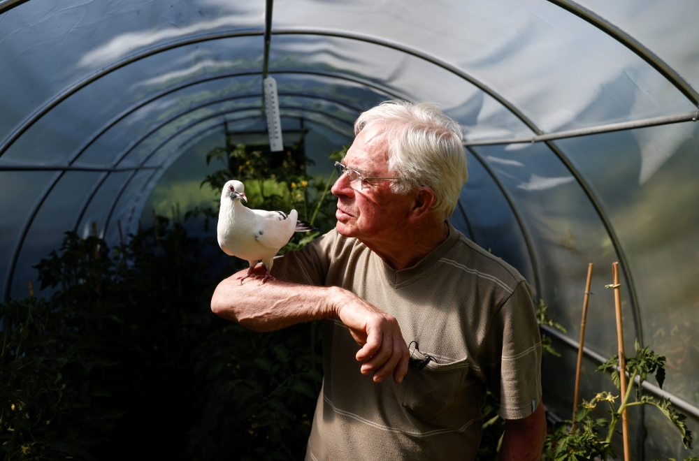 عندما يستقل زافييه بوجيه (80 عاما) دراجته أو يعمل في ورشته أو يروي حديقته أو حتى يجلس لتناول قطعة من البسكويت، ترافقه دائما صديقته.. حمامة بيضاء أطلق عليها اسم بلانكو.