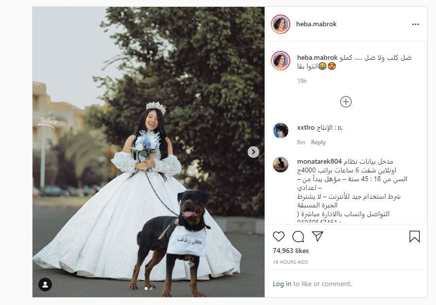 نشرت المدونة المصرية هبة مبروك صوراً لها عبر حسابها على إنستغرام برفقة كلب وعلقت في عنقه لافتة (حفل زواج).