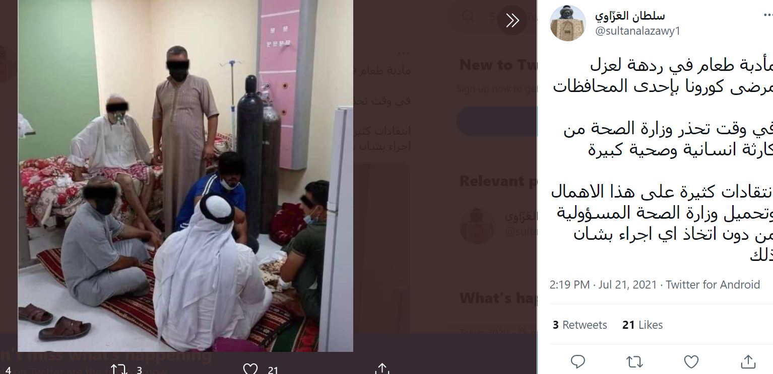 أثارت صور لمأدبة غداء في غرفة مصاب بفايروس كورونا، موجة غضب كبيرة في الشارع العراقي، وتظهر الصور مجموعة من الأشخاص في أحد مراكز عزل مصابي كورونا، يفترشون أرض حجرة المريض لتناول الطعام .