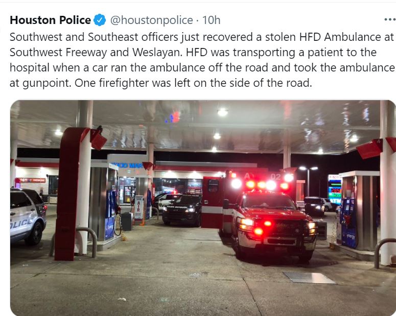 قالت شرطة هيوستن بولاية تكساس الأمريكية إن مسلحا سرق سيارة إسعاف في وقت مبكر اليوم، بينما كان مريض ورجل إطفاء بداخل السيارة.