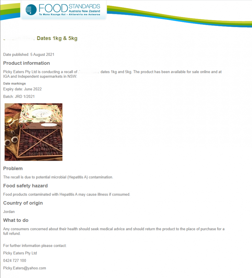 وقال الموقع إن هيئة الغذاء في نيو ساوث ويلز أكدت أن أي ارساليات أخرى من المنتج سيتم الاحتفاظ بها على الحدود، حتى تتمكن السلطات الأردنية ضمان معالجة خطر التلوث.