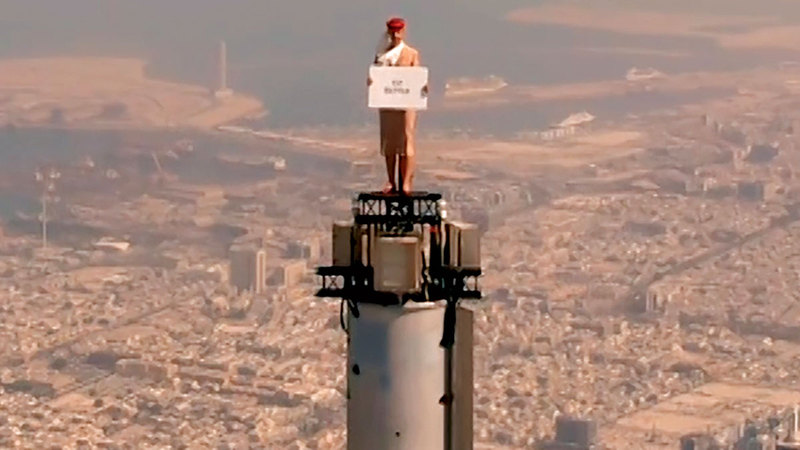 عُرفت «طيران الإمارات» بإعلاناتها الجريئة وأفكارها المبتكرة، لكن أحدث إعلاناتها التجارية تفوّق على كل ما سبق، حيث تظهر فيه إحدى المضيفات بالزي الرسمي الكامل، تقف بثبات وثقة على قمة برج خليفة، على ارتفاع 828 متراً فوق سطح الأرض، لتنضم بذلك إلى قليلين حظوا بامتياز الوقوف على قمة أعلى مبنى في العالم، في مقدمتهم سمو الشيخ حمدان بن محمد بن راشد آل مكتوم، ولي عهد دبي، والنجم العالمي توم كروز.