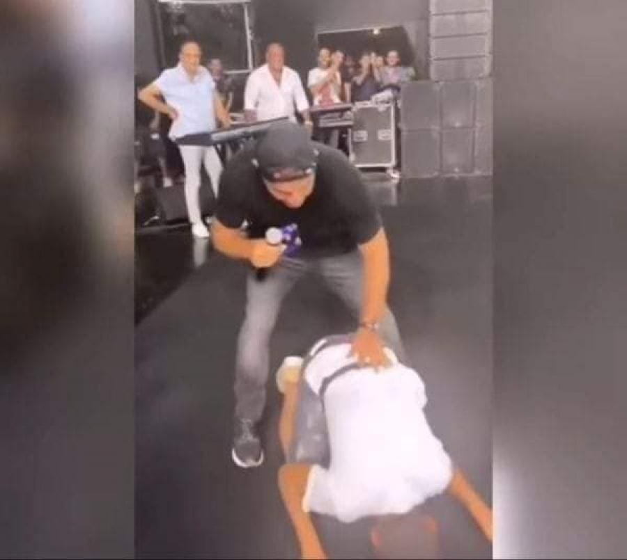 الشاب صعد لكي يقدم هدية لعمرو دياب، وعقب الوصول له قام بالسجود شكرا لله على ما حدث، فما كان من «دياب» سوى التفاعل معه والتقاط صورة تذكارية رفقته.