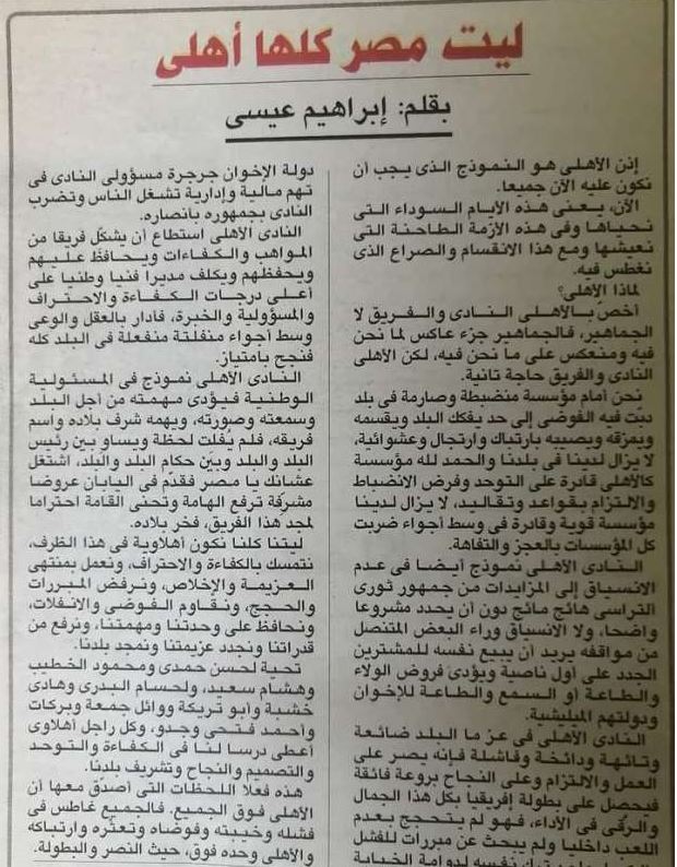 تصدّر هاشتاج الإعلامي المصري إبراهيم عيسى، تريند موقع «تويتر» في مصر؛ عقب تداول نشطاء مواقع التواصل الاجتماعي، لمقال قديم للكاتب يعود تاريخ نشره إلى 2012، في جريدة «التحرير»، ويحمل عنوان «ليت مصر كلها أهلي»، والذي يمتدح فيه الكاتب إنجازات النادي الأهلى، وذلك بعد انتقاد إبراهيم عيسى للنادي الأهلى في الأسبوع الماضي، ووصفه لشعار «الأهلي فوق الجميع»، بشعار «النازية».